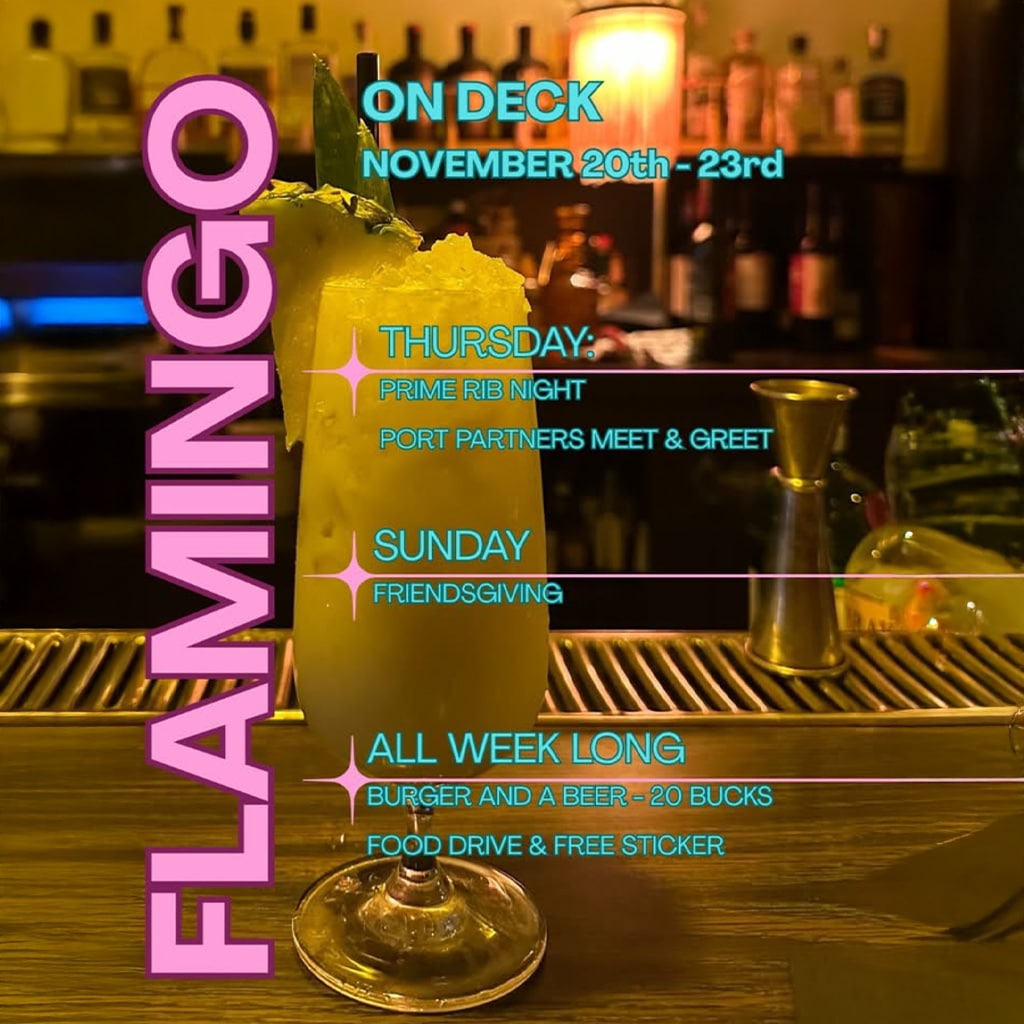 It's our last week open until the break. Starting it off strong w/ our prime rib night which is overlapping with a kick-of meet and greet for the port partners project. All week long, the food drive continues with a free sticker for a canned good or non-perishable food item. Also the burger and beer special for 20 bucks pushes throughout the week. Finally, we close things out with our Friendsgiving Event. $20 buffet, $5 of which will go to the food shelter along with everything from our food